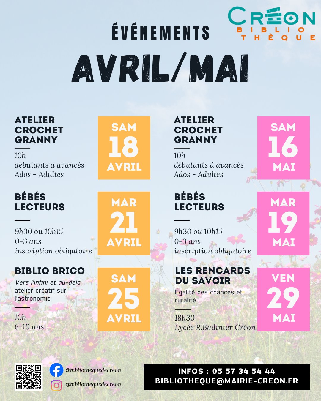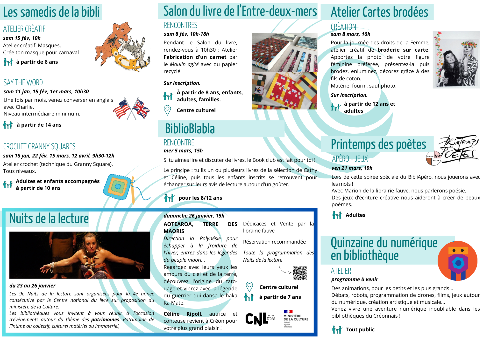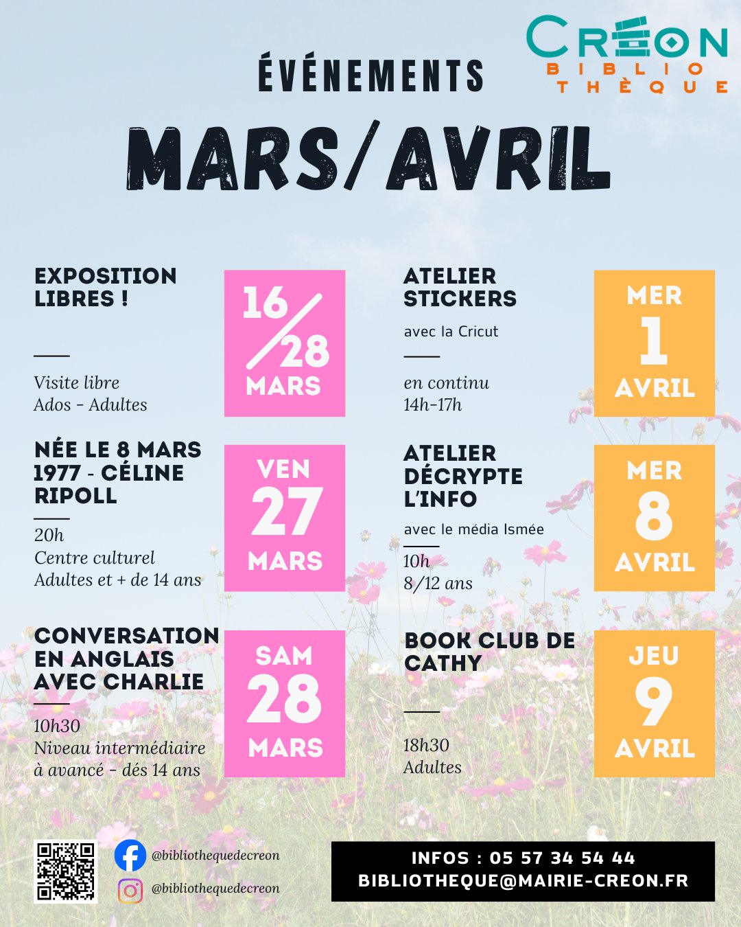 Inscriptions/Réservation : 05 57 34 54 44 / bibliotheque@mairie-creon.fr