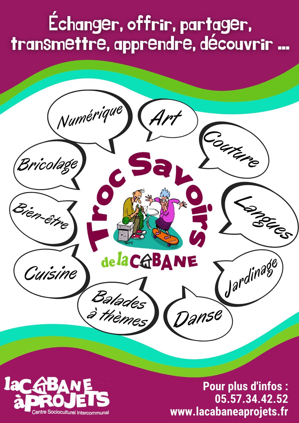 Vous avez une compétence, un savoir à partager ? Envie d'apprendre à tricoter, à jardiner, à utiliser un logiciel ou à cuisiner un plat exotique ? Le Troc Savoirs de la Cabane est fait pour vous !