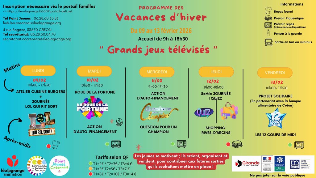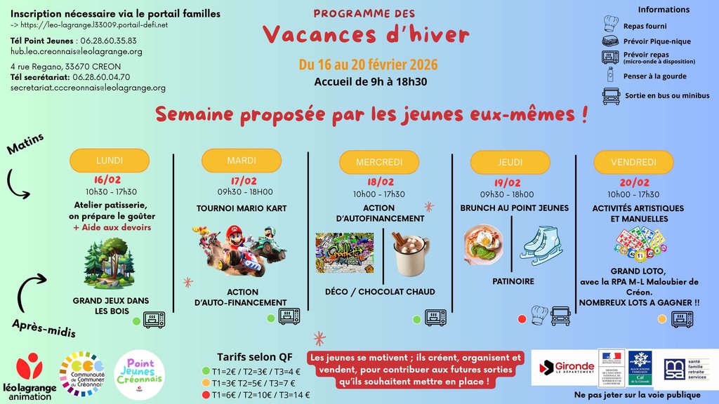 Le Point Jeunes Créonnais vous propose deux semaines riches en animations. Ateliers de cuisine, jeux, quizz, jeux vidéo, ateliers créatifs, loto, patinoire... et bien d'autres activités !
