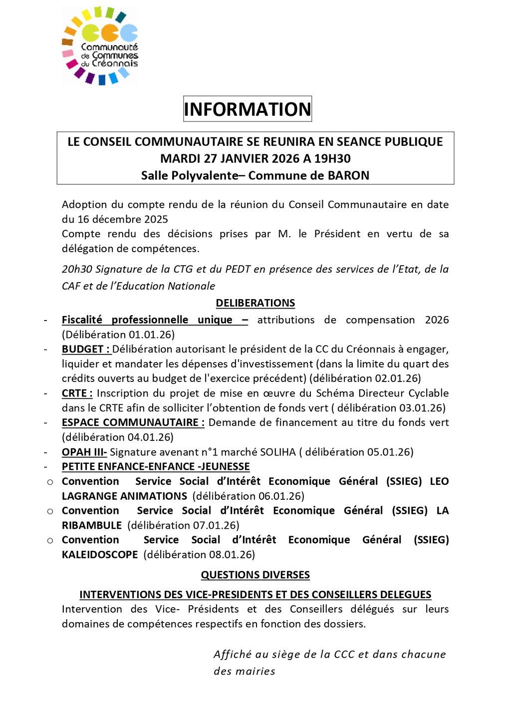 [CONSEIL COMMUNAUTAIRE] - MARDI 27 JANVIER 2026