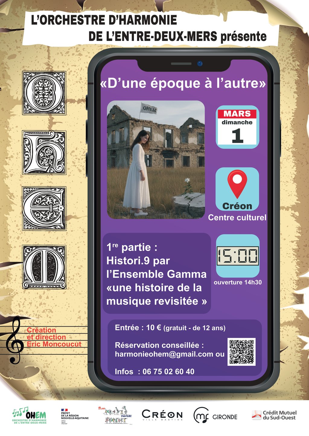 Le dimanche 1er mars 2026 aura lieu au centre culturel de Créon le premier spectacle de 2026 de l’OHEM, Orchestre d’Harmonie de l’Entre-deux-Mers.