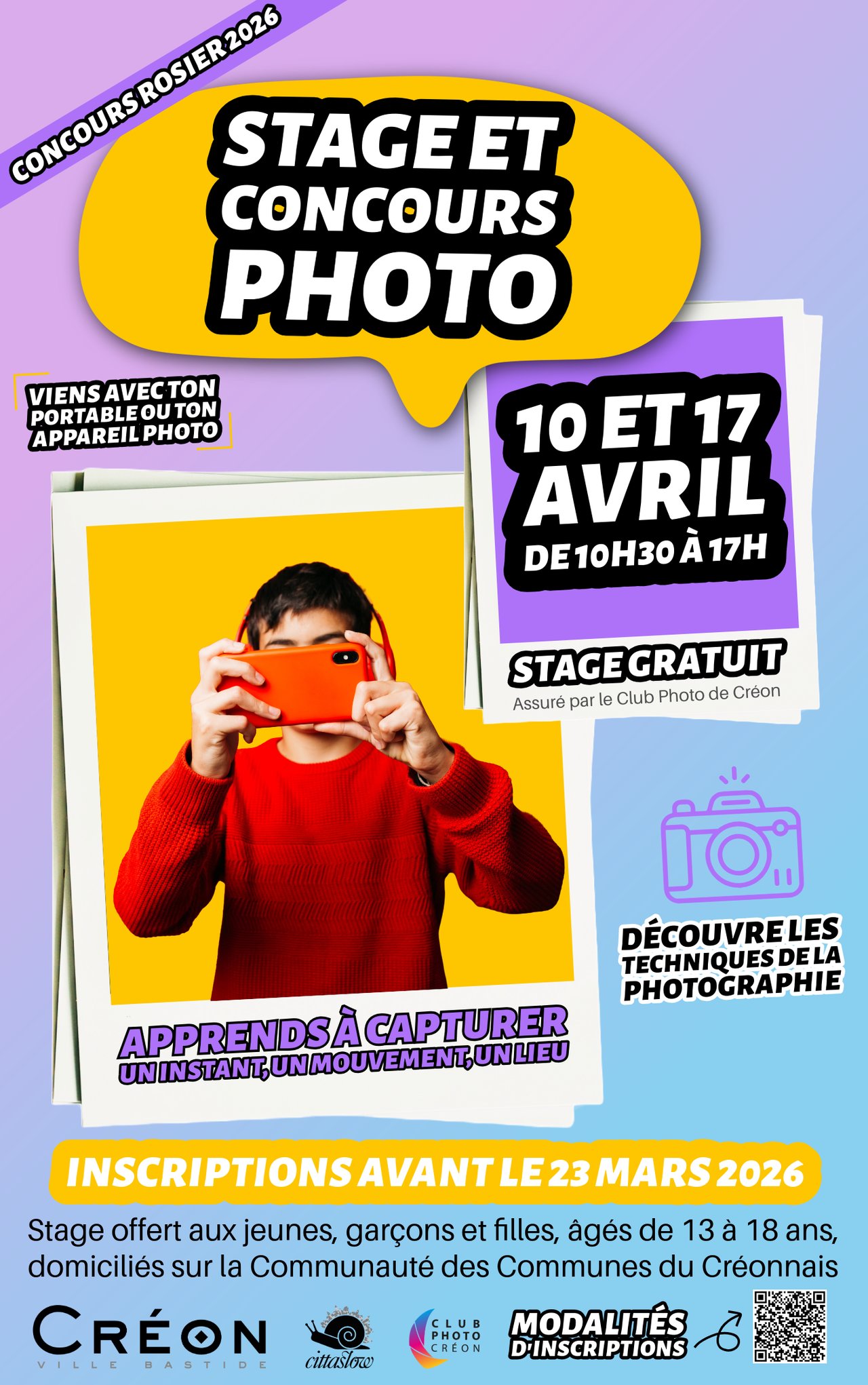 LE CONCOURS : réservé aux garçons domiciliés à Créon (règle liée à un legs dont la commune a bénéficié). Cependant, toutes les photos réalisées par tous les stagiaires seront imprimées et exposées (mairie, lycée, bibliothèque…), et présentées lors des Fêtes de la Rosière et du Rosier, fin août 2026.