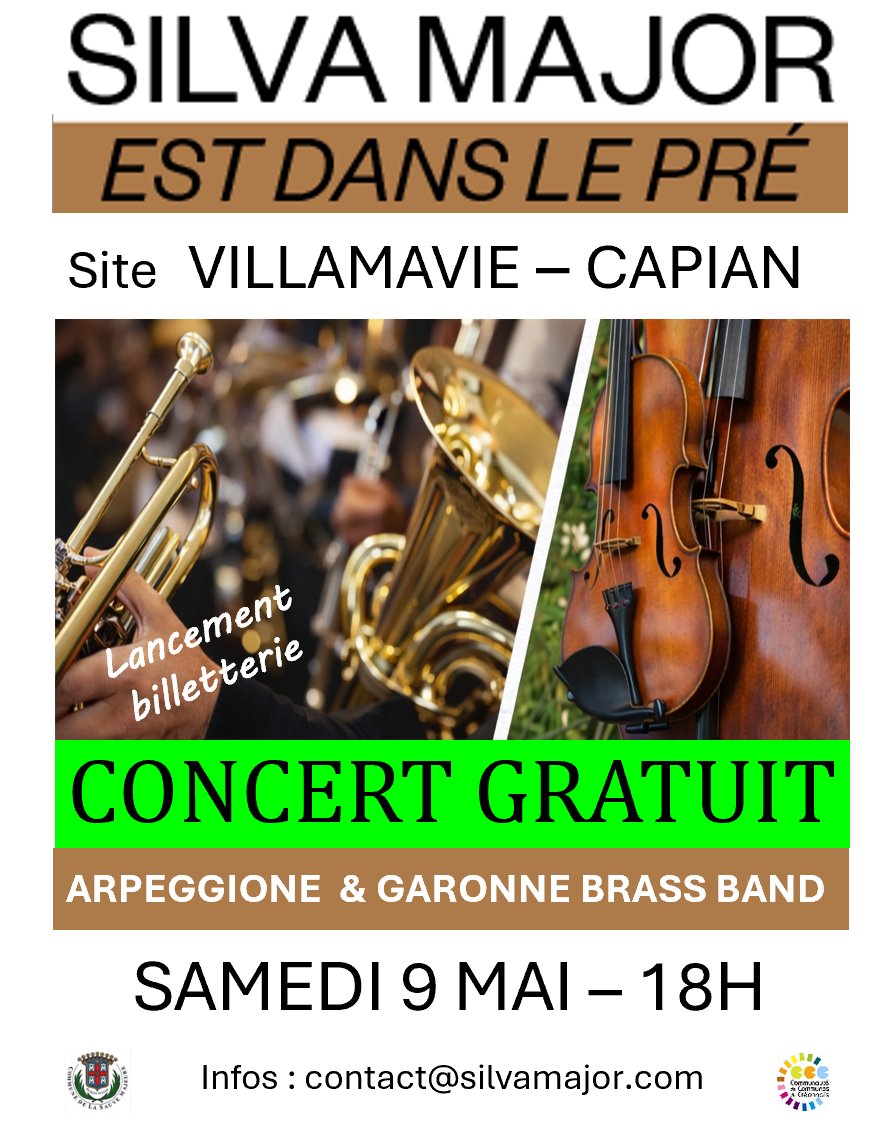 Le Festival SILVA MAJOR vous propose en avant saison, deux concerts gratuits (ARPEGGIONE et GARONNE BRASS BAND) à l'occasion de l'ouverture de la billetterie. Cela se fera sur le site de VILLAMAVIE 2 route de La Sauve La Monerie à Capian.