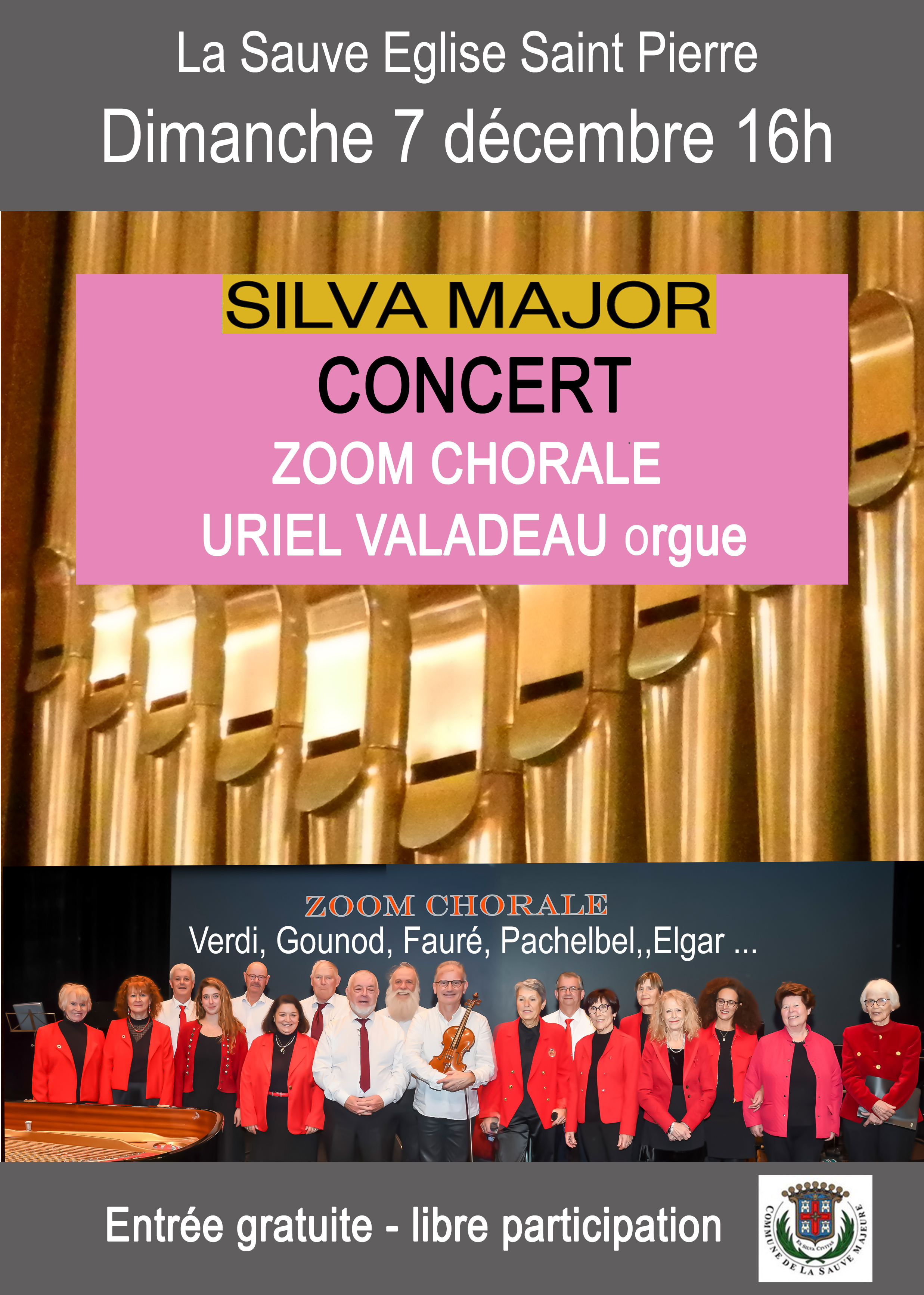 Le Festival Silva Major organise, en l'église Saint Pierre de La Sauve le 7 décembre à 16h, son concert d'automne avec au programme : Verdi, Gounod, Fauré, Pachelbel, Elgar interprété par l'ensemble "Zoom Chorale" accompagné par Uriel Valadeau. l'entrée est gratuite avec libre participation.
