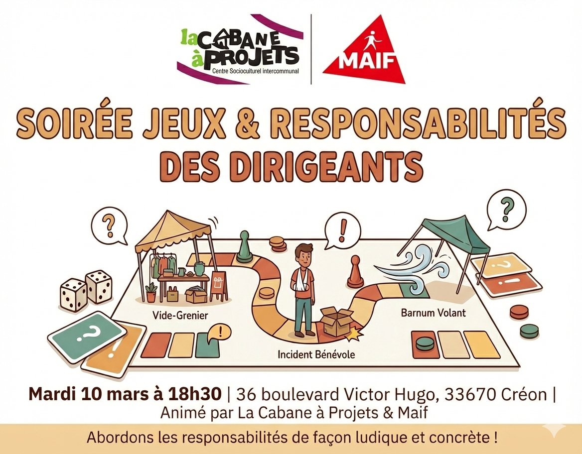 Où ? à la Cabane à Projets (36 boulevard Victor Hugo 33670 CREON)Au programme : Une soirée JEUX sur les responsabilités !